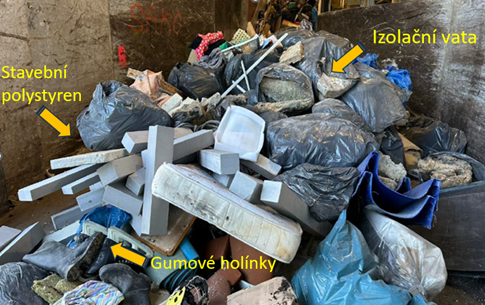 Ukázkový příklad obsahu kontejneru ze sběrného dvora z července 2025, kdy nám celý náklad spalovna vrátila. Převažoval nespalitelný odpad.
