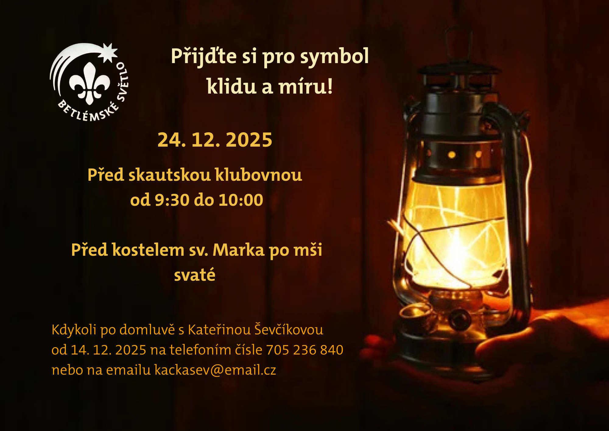 Betlémské světlo Datum konání 24.12.2025 9:30 - 10:00 Přidat do kalendáře Download ICS Google Calendar iCalendar Office 365 Outlook Live